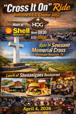 Come join RCs Deno M. and Shawn B. as we take you on a "Cross it On" ride to Sewanee, TN to see the Sewanee Cross Memorial. Meet Shell (Greenbrier Pkwy/ 565) @ 08:30 a.m. KSU @ 09:00 a.m.
