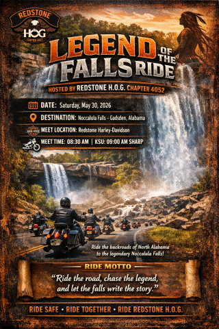 Impairment Policy: The consumption and use of alcohol is a serious personal responsibility involving the safety of family, riding friends, and the individual HOG member.  Alcohol consumption before or during a motorcycling activity is not safe, responsible behavior.  Redstone Chapter #4052 requests you “think before you drink” with the above in mind and refrain from consuming any number of impairment drinks that total more than the number of wheels you are on.  Riders whose skills are observed or suspected to be impaired by alcohol or drugs before riding cannot join the ride.