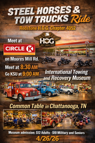 Sunday we will meet at the Circle K on Moores Mill Rd. at 8:30 am go KSU at 9:00 a.m. We will follow 72 all the way into Tennessee with a stop along the way. At the International Towing and Recovery Museum admission is $12 for adults with military and senior at $10. Once everyone has got their fill we will depart for a half mile ride to the Common Table for lunch. We will ride back to Huntsville after lunch. Museum is small, nothing like Barbers.